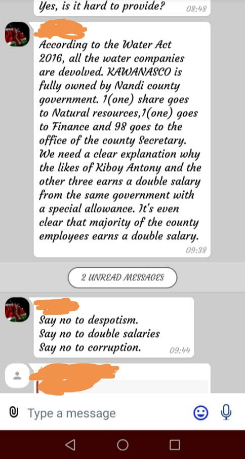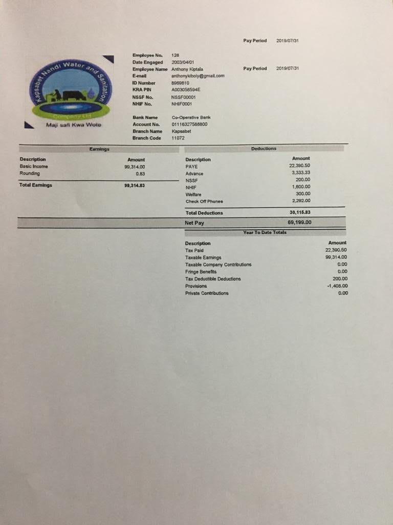 According to the Water Act 2016, the water sector is fully devolved and is owned by the County Government of Nandi. The acting Managing Director (MD) Anthony Kiboiy is seconded from the County government. He earns a salary from the county government together with an acting allowance for the position. However, he also earns a second salary from the company of over 100,000 per month plus other benefits such as airtime allowance and his car is fueled by the company.