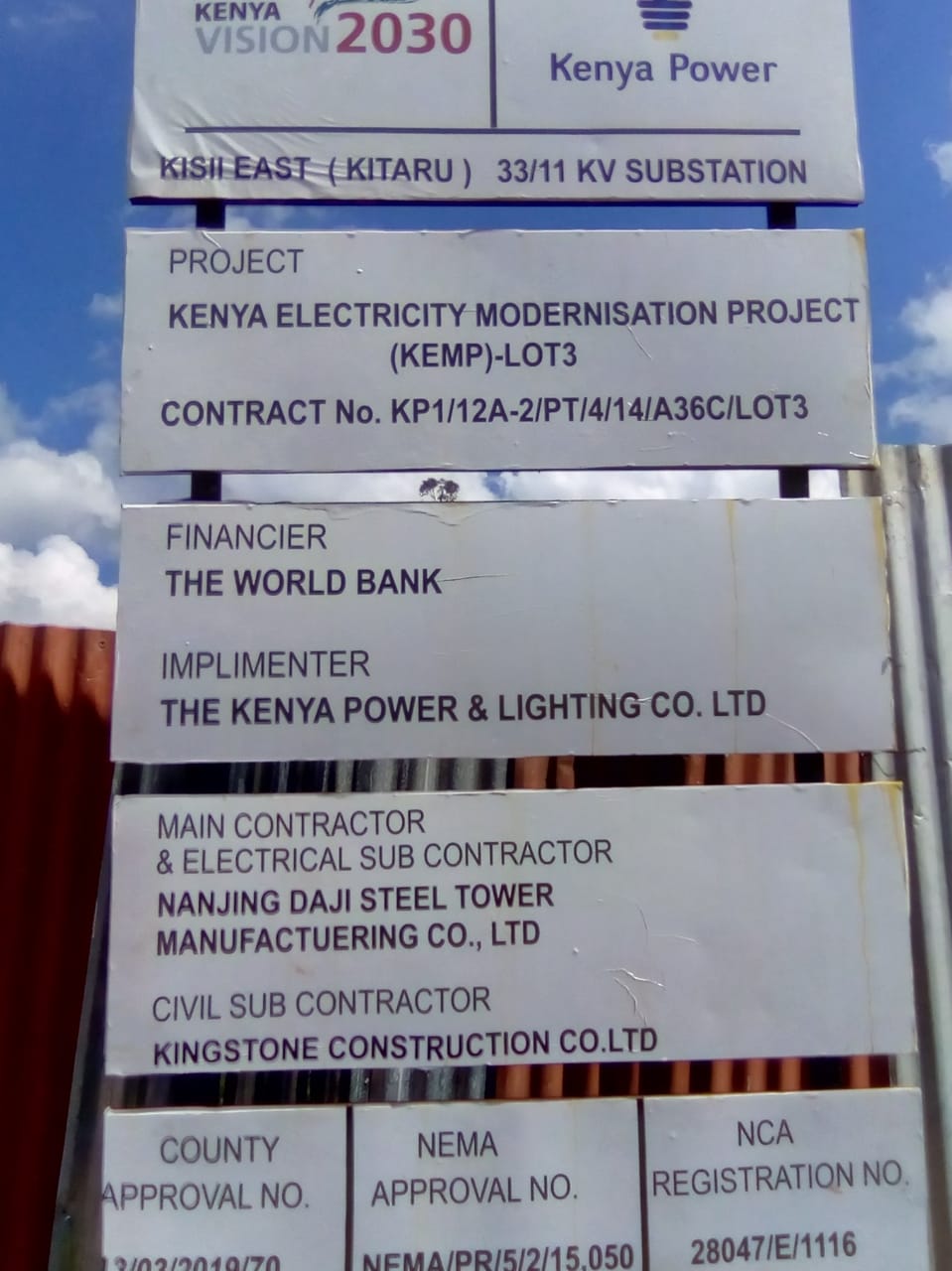 We write to bring to your attention about a project NEMA approval Number PR/5/2/15/, 050 which is being put up. It has become an increasing concern in our Location by the National Government and the Leadership of Kisii County and the Kenya power and Lighting (KPLC), Kenya East Modernization project (KEMP)-