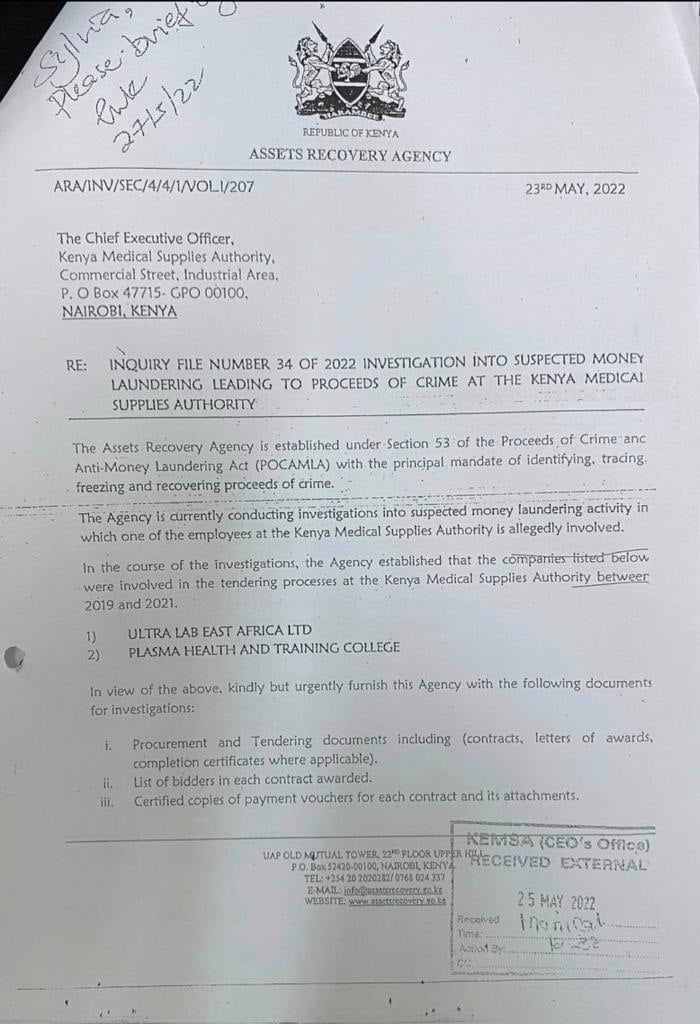CAPTION - INQUIRY FILE NUMBER 34 OF 2022 INVESTIGATION INTO SUSPECTED MONEY LAUNDERING LEADING TO PROCEEDS OF CRIME AT THE KENYA MEDICAL SUPPLIES AUTHORITY