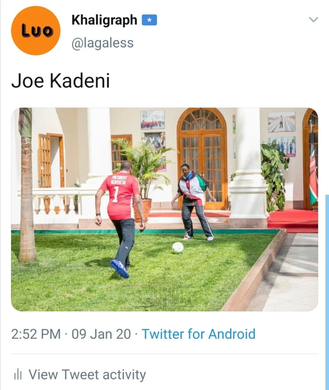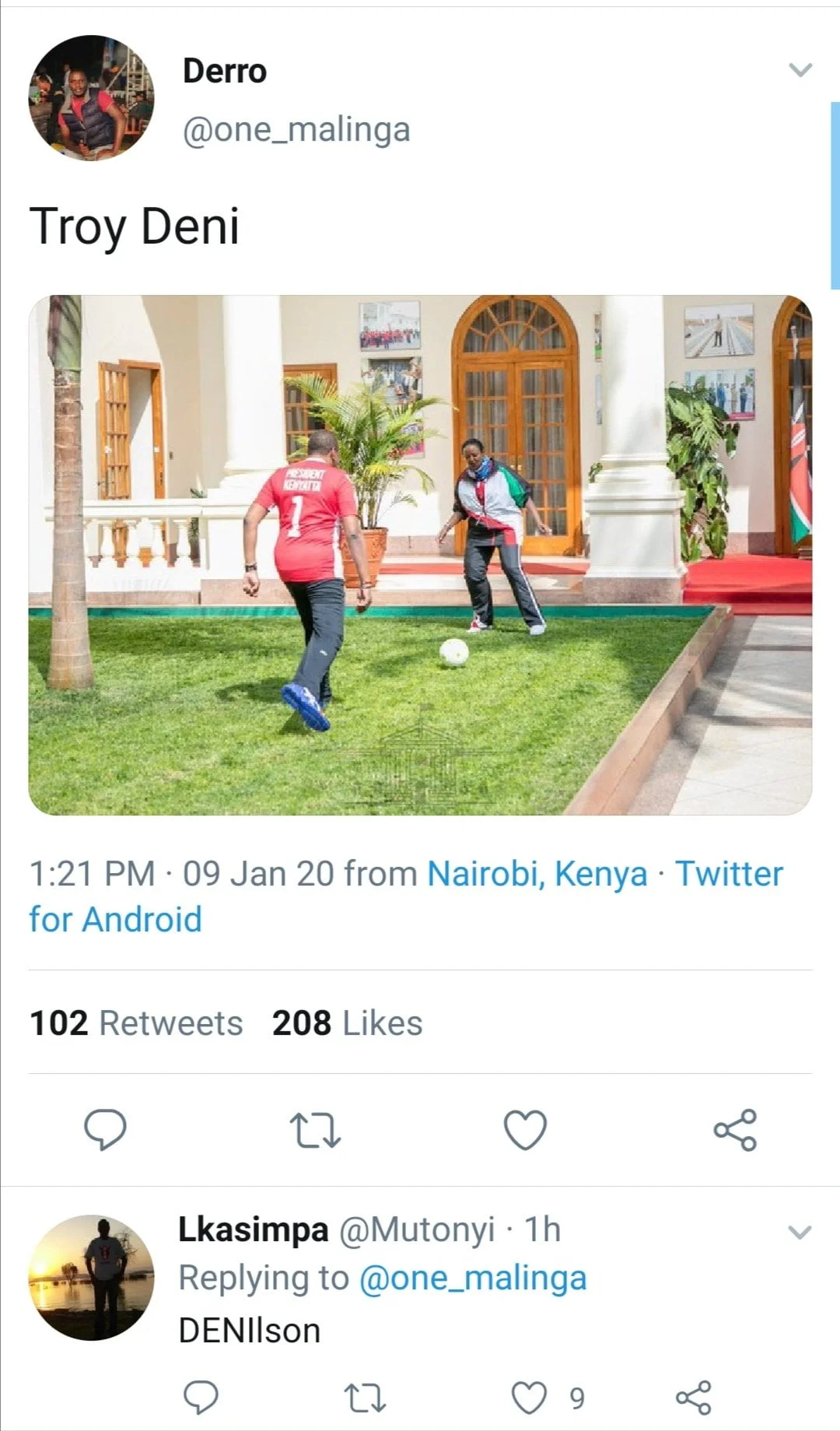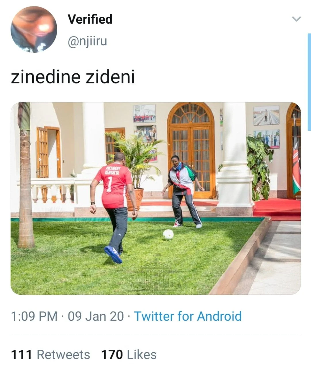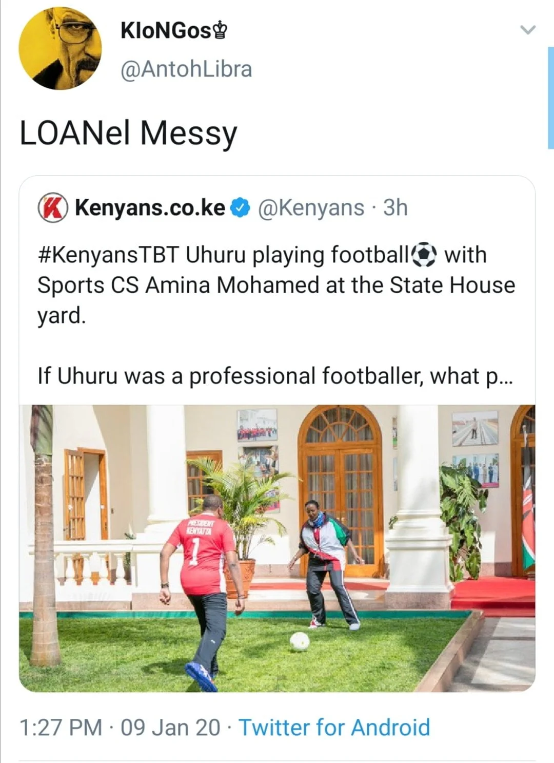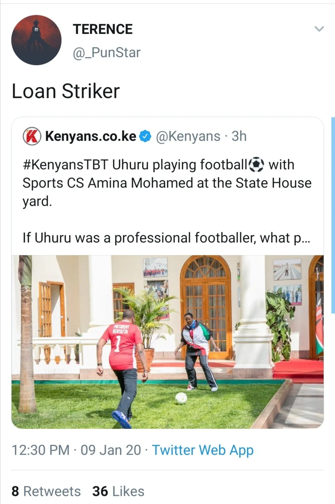 Being a Throw Back Thursday (TBT), Kenyans blog Twitter page shared the photo below with the caption, ‘#KenyansTBT Uhuru playing football⚽️ with Sports CS Amina Mohamed at the State House yard. If Uhuru was a professional footballer, what position would he play?’.
