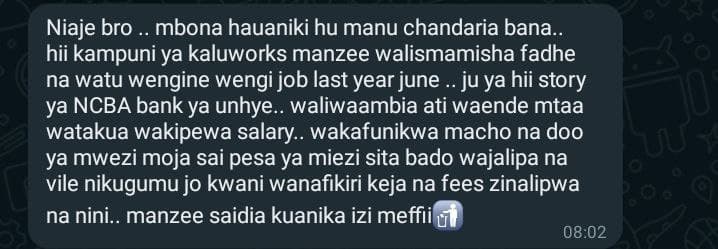“Waliwaambia ati waende mtaa watakua wakipewa salary, wakafunikwa macho na doo ya mwezi moja sai pesa ya miezi sita bado wajalipa na vile nikugumu jo kwani wanafikiri keja na fees zinalipwa na nini?” our source asks in part of the message.