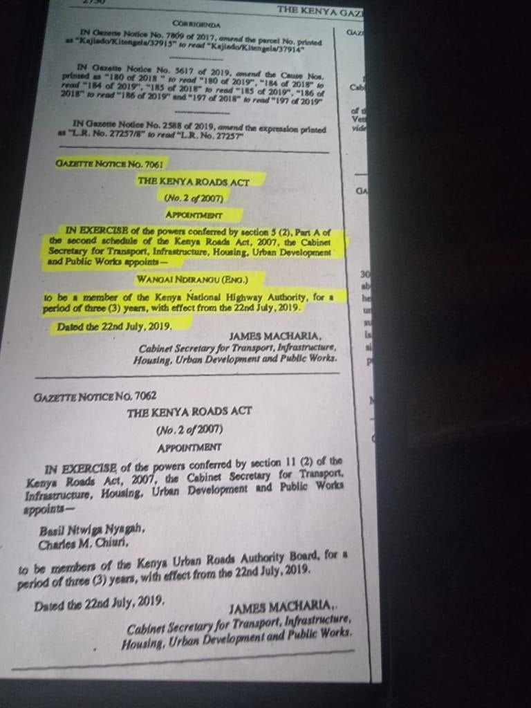 The controversy surrounding disgraced Kenya National Highways Authority (KeNHA) Chairman Eng. Wangai Ndirangu, who faced heavy opposition for holding two public positions against the Ethics Act, has taken a fresh twist.