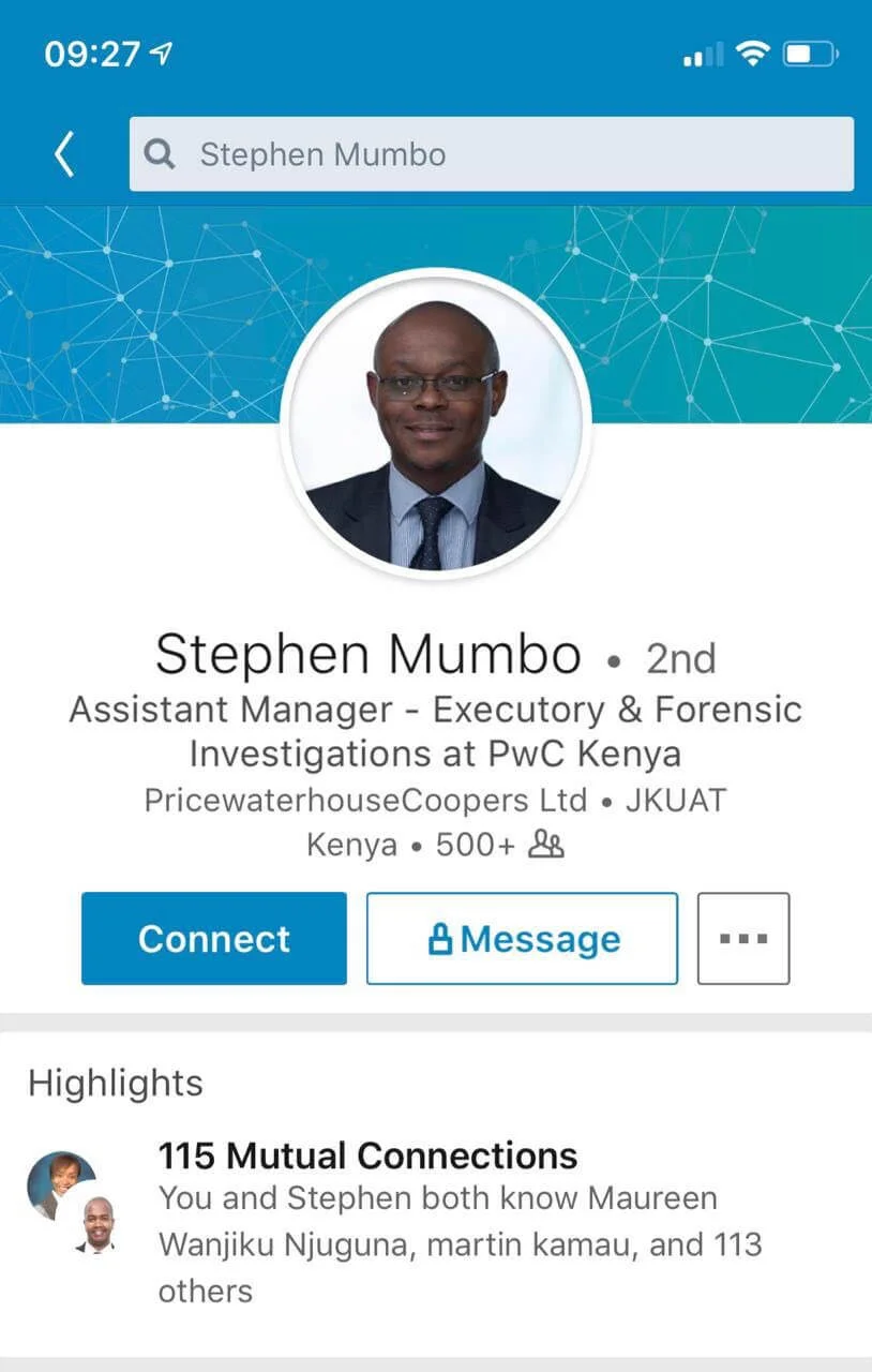 His Linkedin profile says he is the Assistant Manager Executory and Forensic investigations and he schooled at Jomo Kenyatta University of Science and Technology