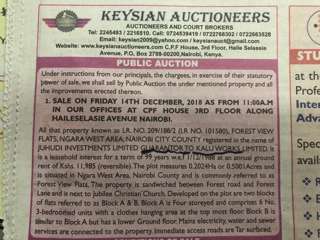 An advert that appeared in today’s dailies and attached hereunder states that Kalu works, owned by Chandaria will be auctioned this Friday, exposing a philanthropist that has been intimidating banks and asking for loans, running into billions.