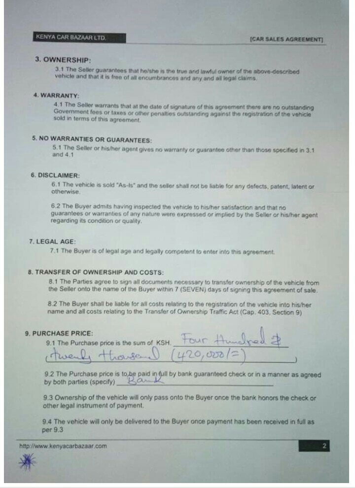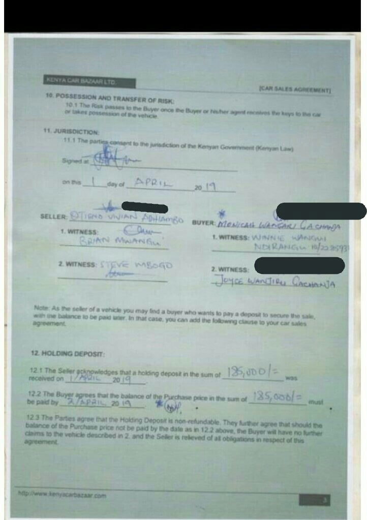 He called my aunt to deposit 50k for documents, he again said that he use his Kshs. 23k to get my aunt National Transport and Safety Authority (NTSA) number.