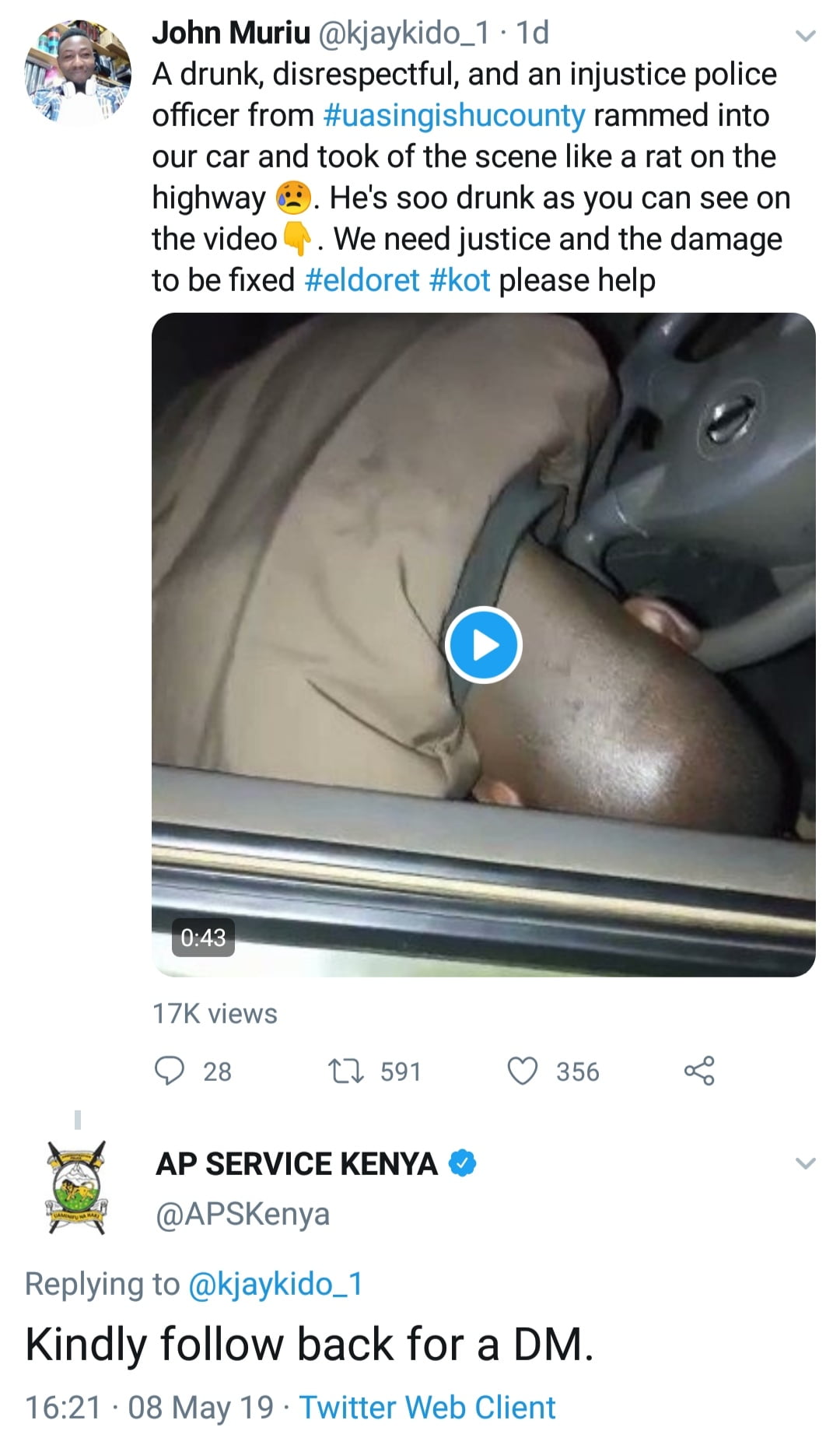 Yesterday a social media user posted a video of an extremely drunk Administration Police Officer who had rammed into their taxi in Eldoret, Uasin Gishu County.