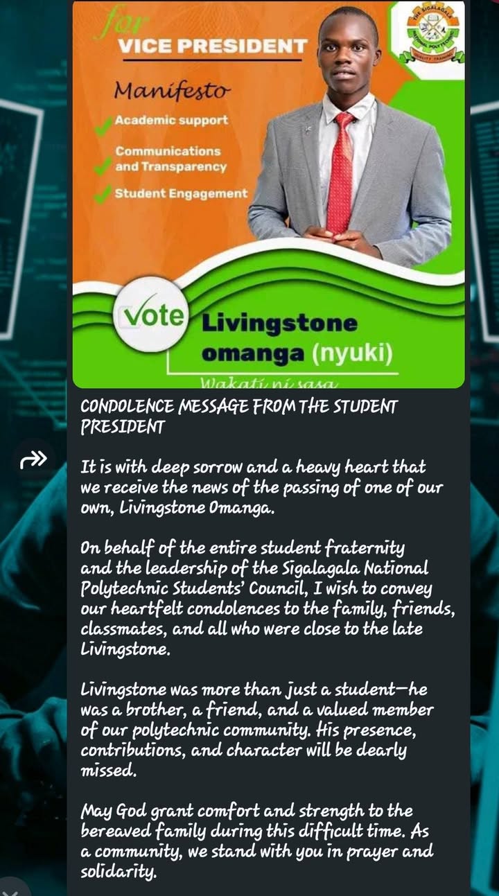 Livingstone Omanga, the Sigalagala National Polytechnic student whose untimely death has sparked protests and raised questions over institutional negligence.
