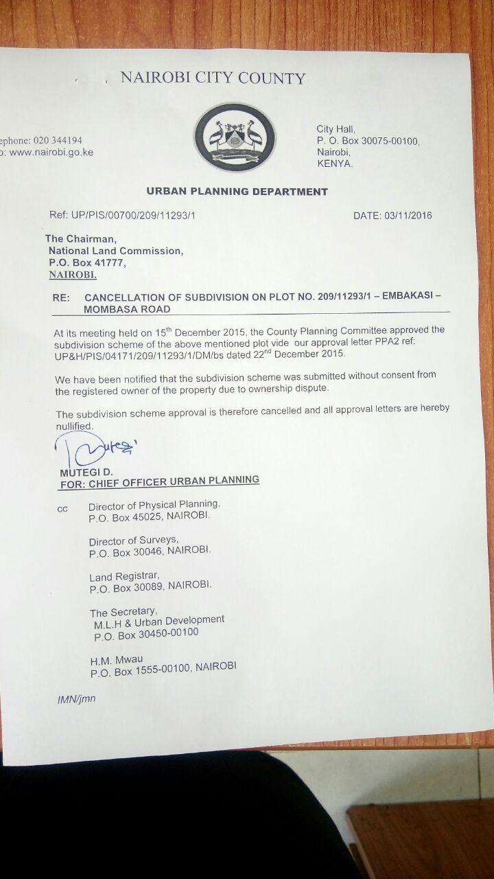 CAPTION: The cancellation letter sent to National Lands Commission Chair Muhammad Swazuri, who had been bribed to endorse this fraudulent activity.