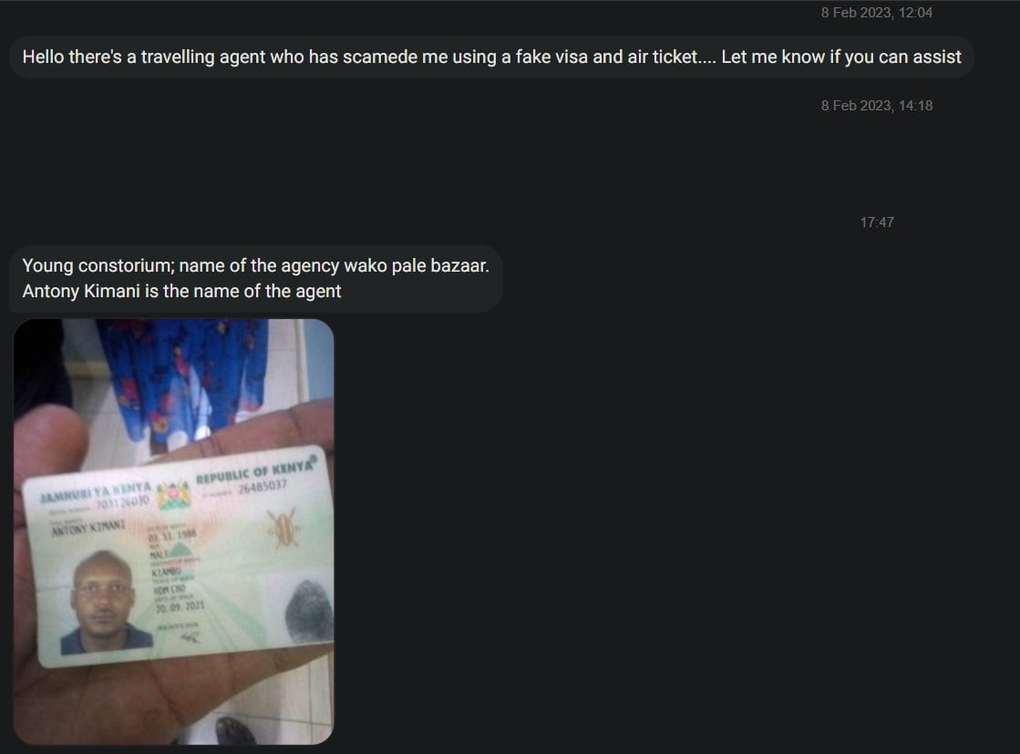 A young man, who wishes to remain anonymous, is seeking assistance after falling victim to a scam by a travel agency known as Young Consortium located at Bazaar in Nairobi. The man claims that he was scammed by an agent named Antony Kimani, who sold him a fake visa and air ticket. Writing to this blog on Wednesday, Fe