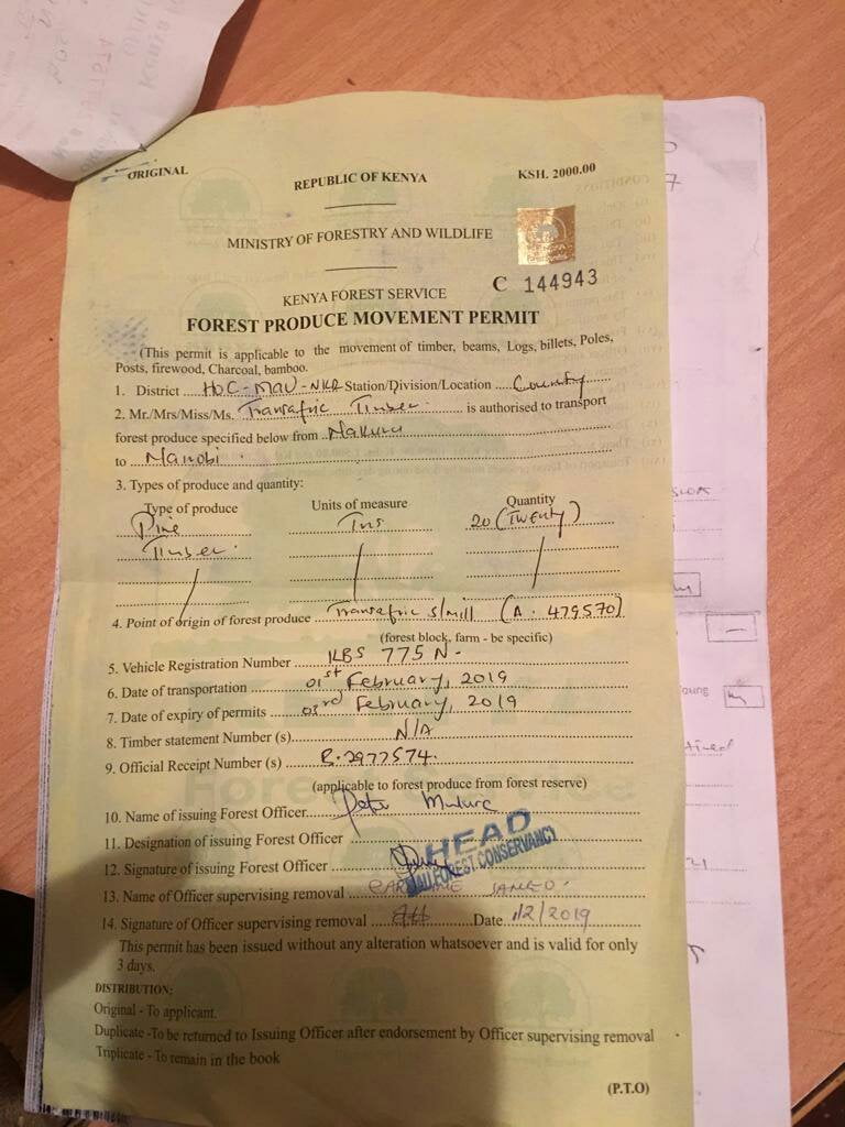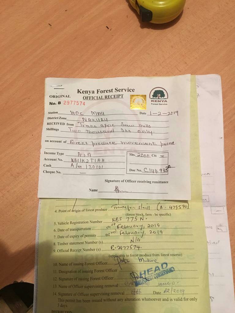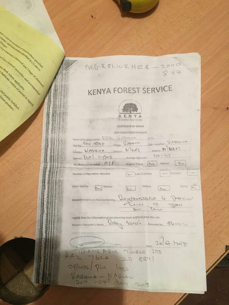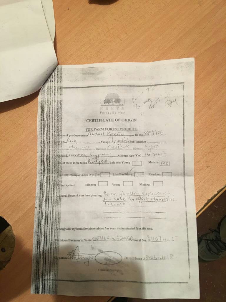 Those are the documents used. If you check clearly you will see the two certificates are dated 2015 and 2018 different places of origin and different persons. The permit was issued to one Zakayo of transafric timber in Nakuru. This should be exposed, he has been doing many corrupt activities, no wonder tutaendelea kugongwa from Somalia