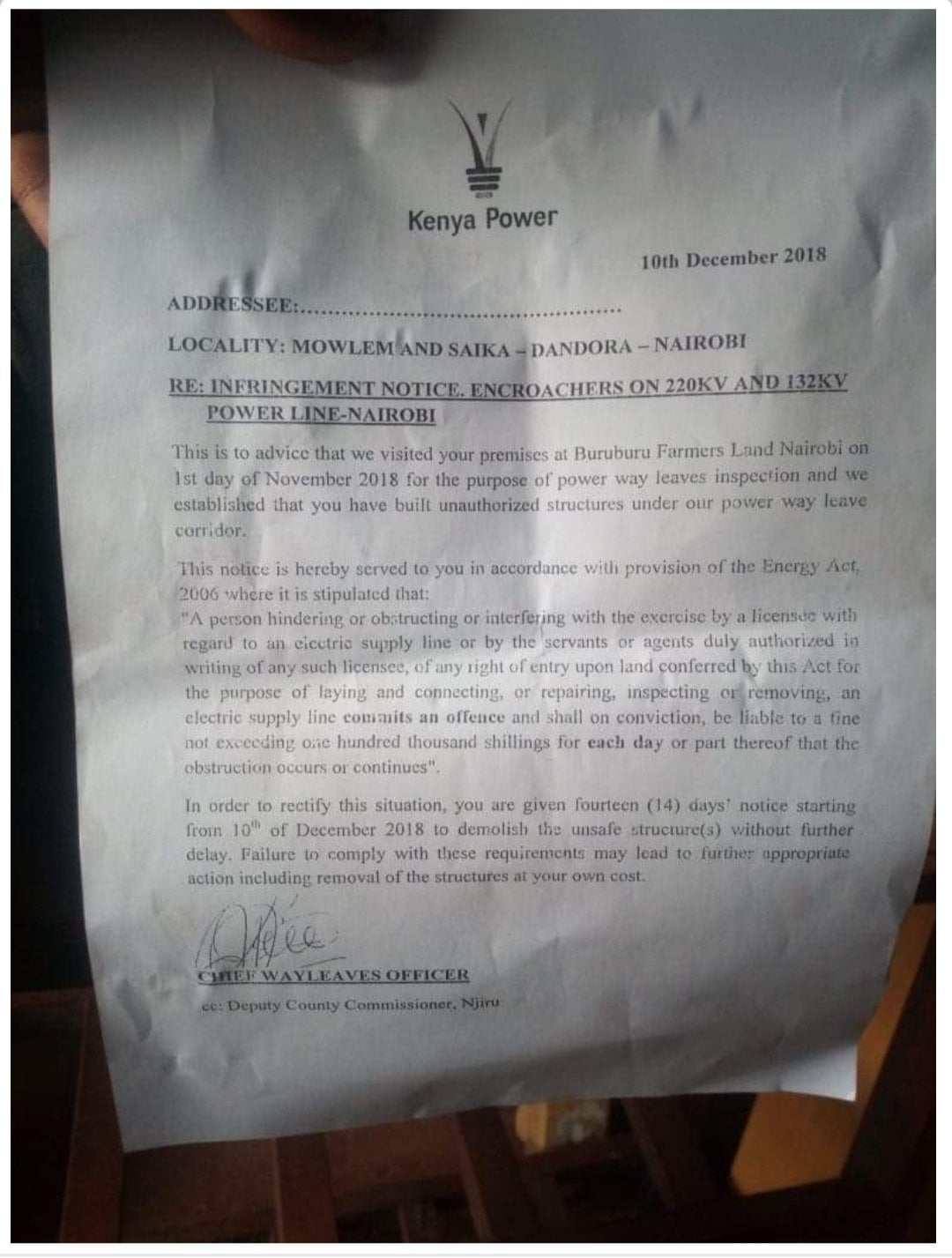 However, KPLC have decided to erroneously mark 33 metres on a 132 KV, essentially marking our buildings for demolitions in Chokaa, Njiru Saika.