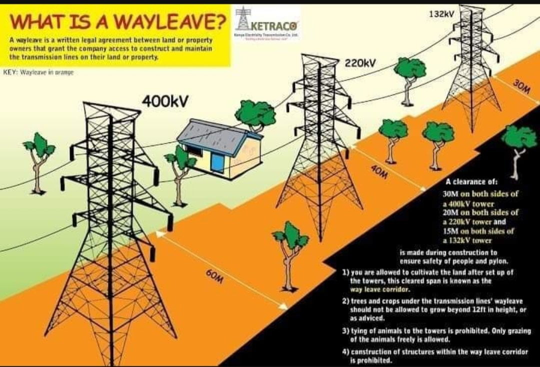 KPLC policy on transmission Line 220KV wayleave clearance both sides is 20 metres; for 132 KV transmission line, the wayleave is 15 metres.