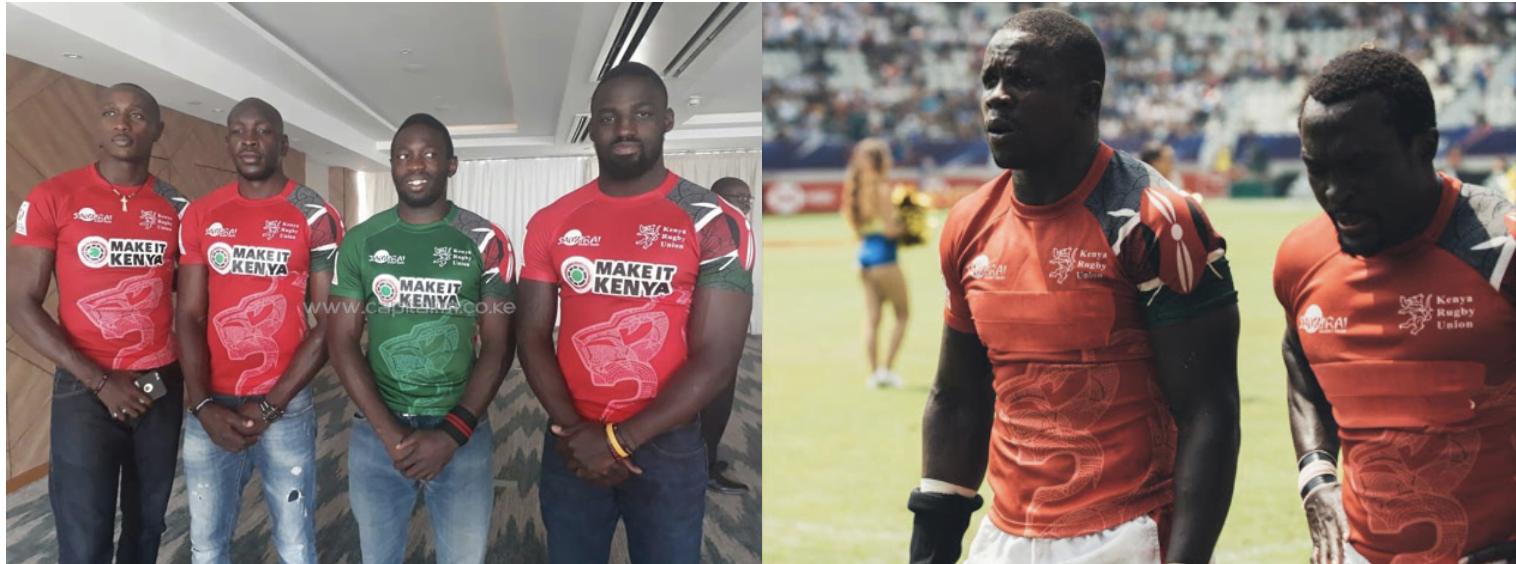 Kenya 7s Jersey at the launch of the partnership with Brand Kenya (Right) walk of shame by Ambaka and Injera after blocking the sponsor logo