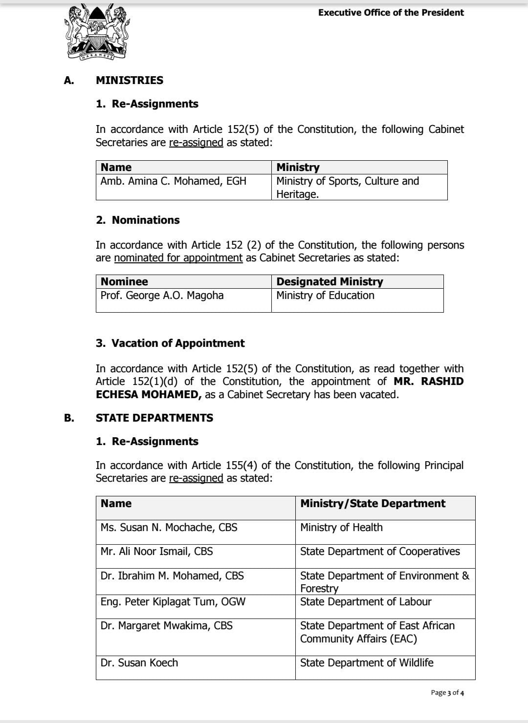 Other changes included re-assignments in various state departments including the Ministry of Health, the State Department of Co-operatives, Environment and Forestry, Labour, East African Community Affairs and Wildlife.
