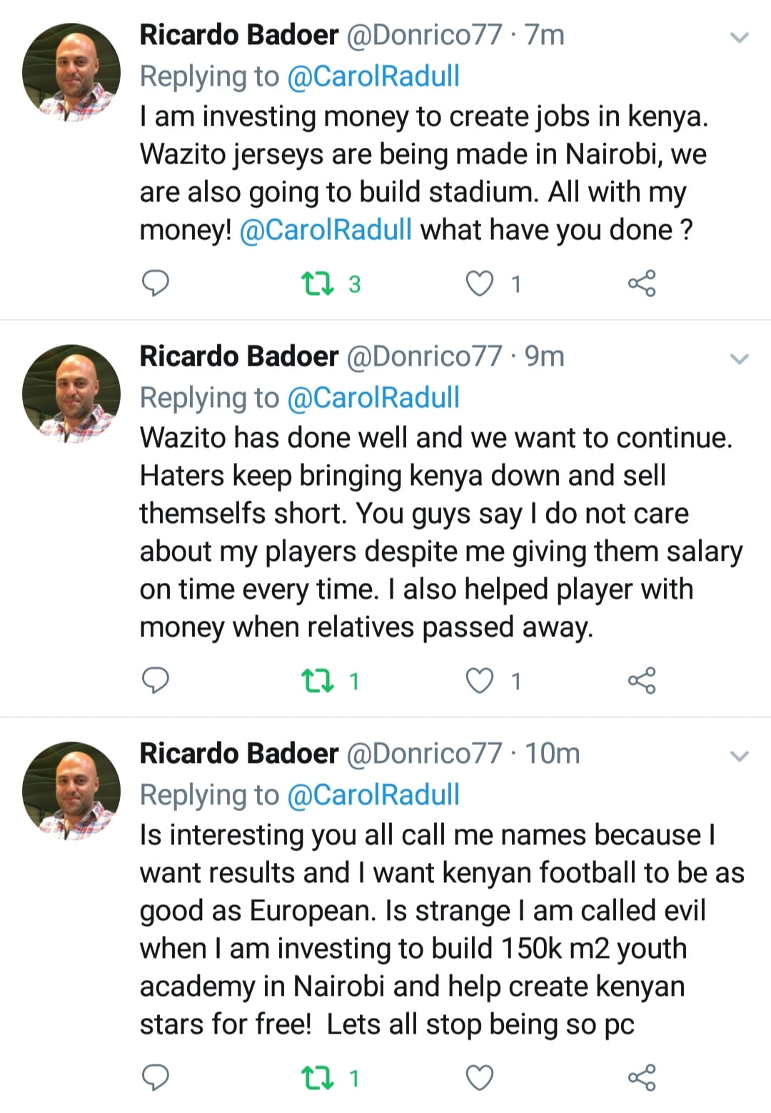 Wazito FC owner Ricardo Badoer took to social media to scold his team's players after yet another poor performance and defeat in the National Super League.