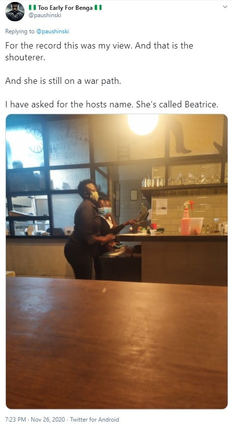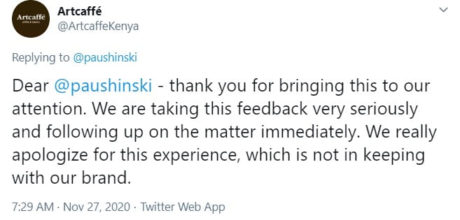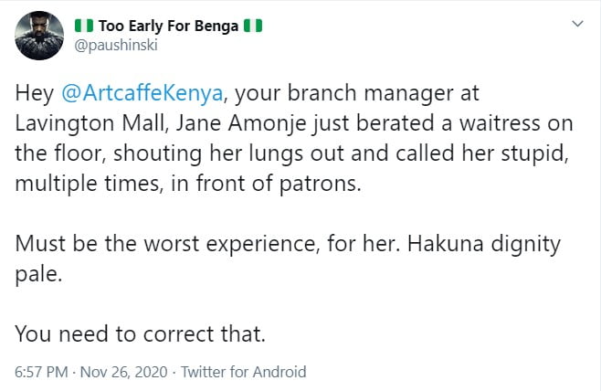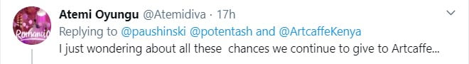The user only identified as “Paushinski” from his ten-year-old Twitter account which holds a draws quite a reasonable following sparked the uproar after he shared out a post claiming he had witnessed a senior Artcaffe superintendent publicly humiliating a waitress on the floor at one of the institution’s branches within the city.