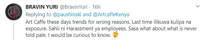 “Artcaffe these days trends for wrong reasons. Last time ilikuwa kulipa na exposure. Sahii ni harassment ya employees. Sasa what about what is never told pale. I would be curious to know…” Bravin Yuri, a popular Twitter user, wrote.