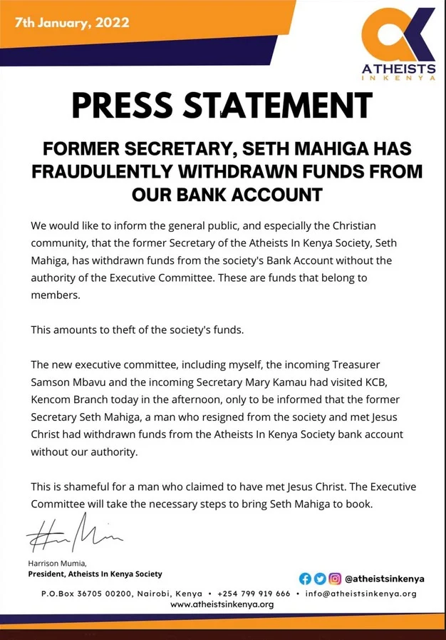 “We would like to inform the general public, especially the Christia community, that the former Secretary of the Atheists In Kenya Society, Seth Mahiga, has withdrawn funds from the society’s Bank Account without the authority if the executive committee,” read part of the statement.