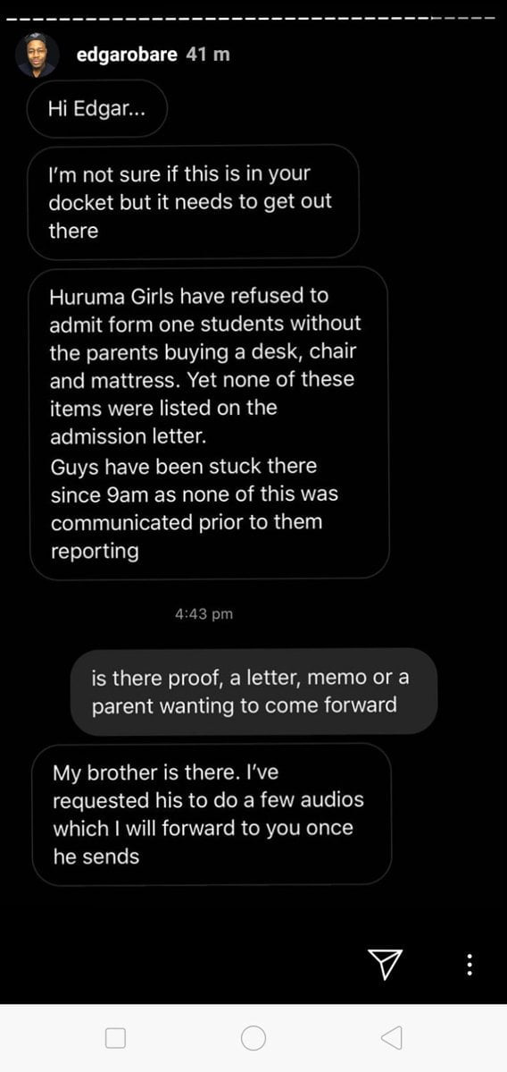 @jay_steveO @sscuthbertson @citizentvkenya @ntvkenya @JoeWMuchiri1 @KTNNewsKE @LarryMadowo @xtiandela @FredMatiangi @edgarobare Huruma Girls have refused to admit form 1 students without them buying a desk, chair and mattress. Yet none of these items were on the admission letter