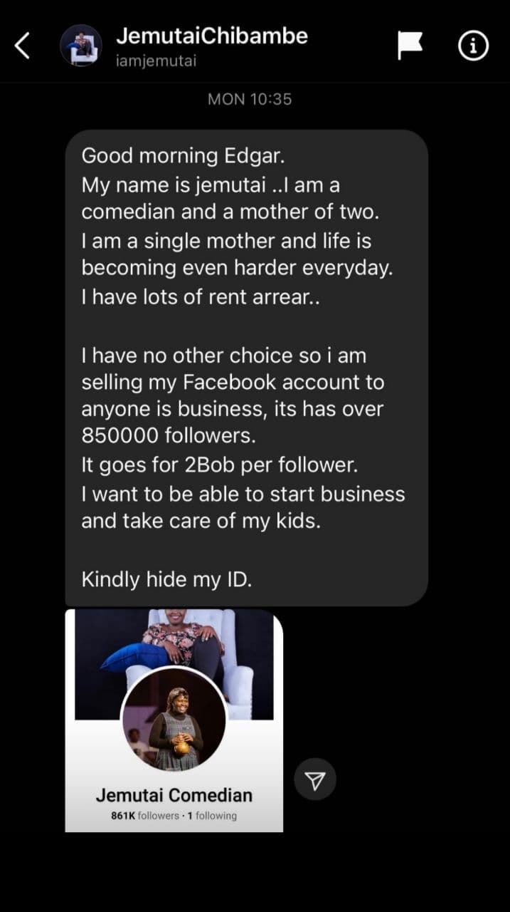 She had initially contacted the blogger to seek help on how to sell her massively followed Facebook page due to the financial constraints she is currently facing.