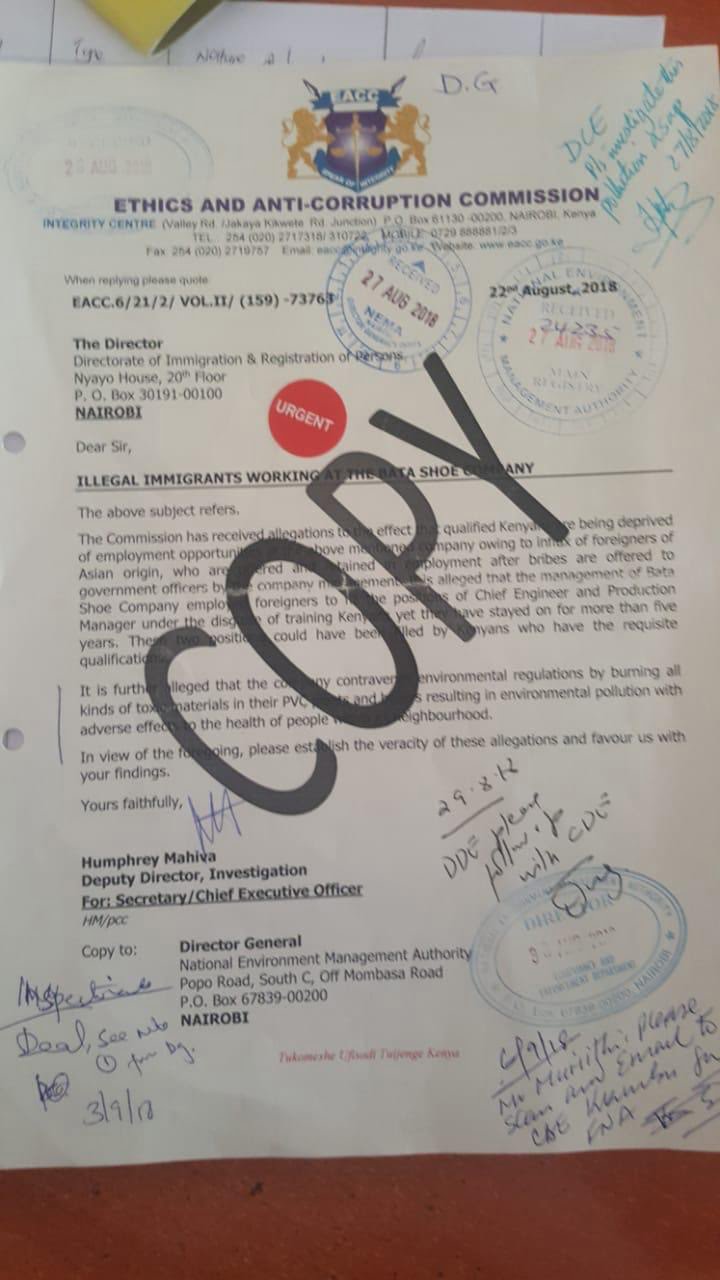 In a letter to EACC, anonymous employees exposed how Bata senior management was discriminating against Kenyans by hiring Asians despite qualified Kenyans by way of bribing immigration.