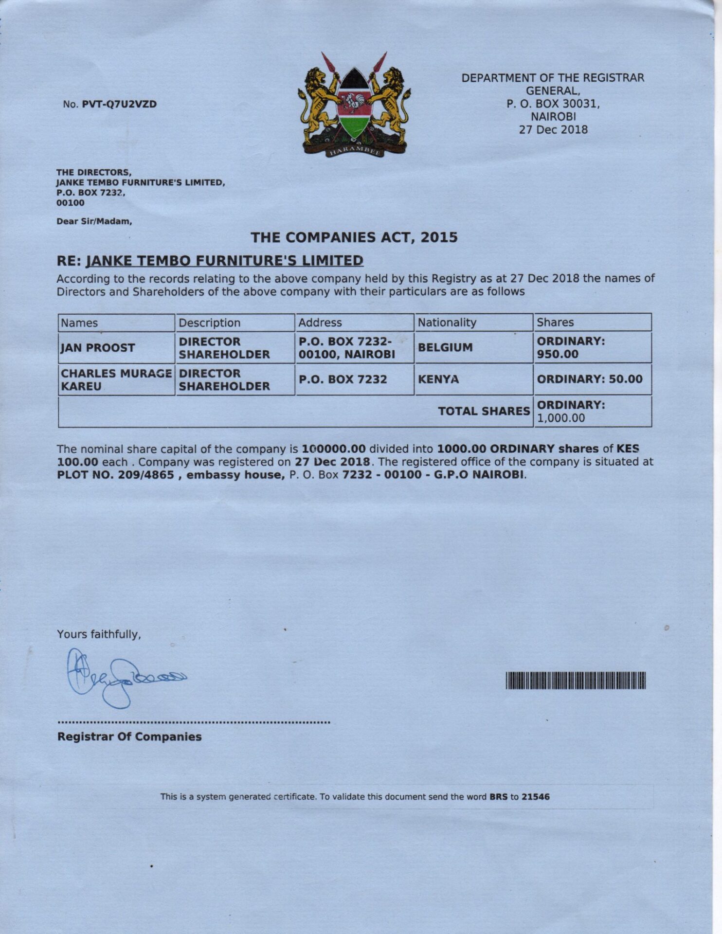 That’s why, 25 January 2017, I have sold my house in Turnhout, in Belgium. I was gullible and I bought second-hand and outlet seats in Belgium for 150,000 €, which were purchased by our joint business “Euro Furniture Paradise” for shipment to Mombasa, then were sold on the compound in Kasarani. We did not charge each other working hours and with the profit (after deduction of costs incurred) my investment would be paid back so that I could buy my own plot of land and build my shop. The atmosphere was good and there was open communication. I was comfortable with it.