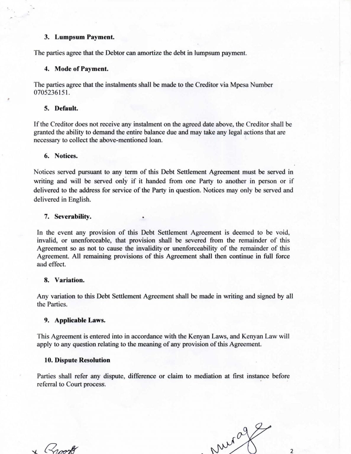 Kshs. 4,600,000/= which is a friendly loan advanced to the Debtor to be paid in monthly instalments of Kshs. 100,0000/= which shall be payable upon successful completion of above.