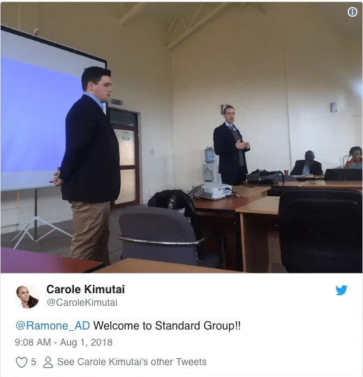 Caption: Twitter Executives at Standard Media Group during their early August visit to Kenya. They met Government officials and attended a Safaricom Blaze event. The Blaze event was organized by Scangroup, an agency whose employees have been lobbying for the suspension of Nyakundi from Twitter.