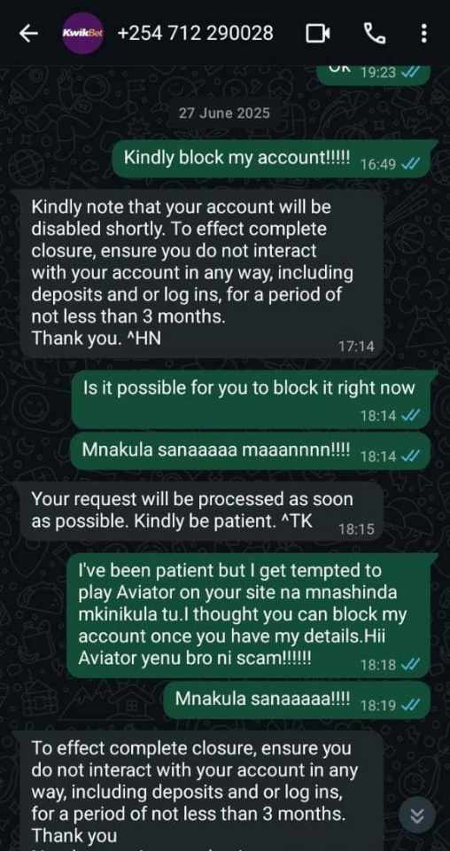 Operated by Solami Limited and licensed by the Betting Control and Licensing Board (BCLB) under license number BK-0001133, KwikBet has been accused of enforcing a mandatory dormancy period of up to three months before accounts can be fully disabled, while failing to provide timely and consistent responses to closure requests, a practice that many users describe as exploitative and deliberately designed to maximize company profits.