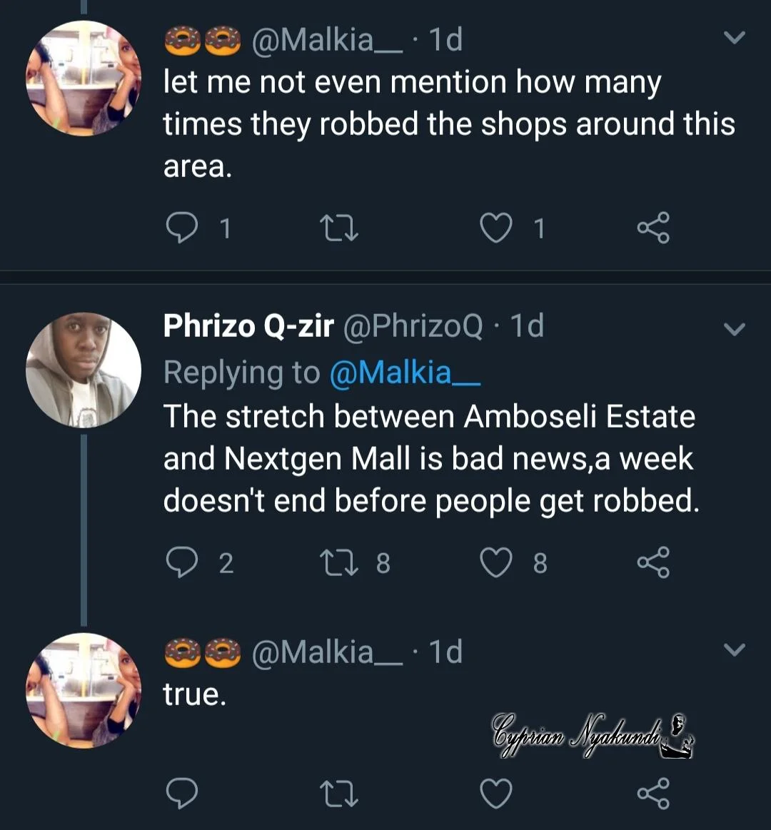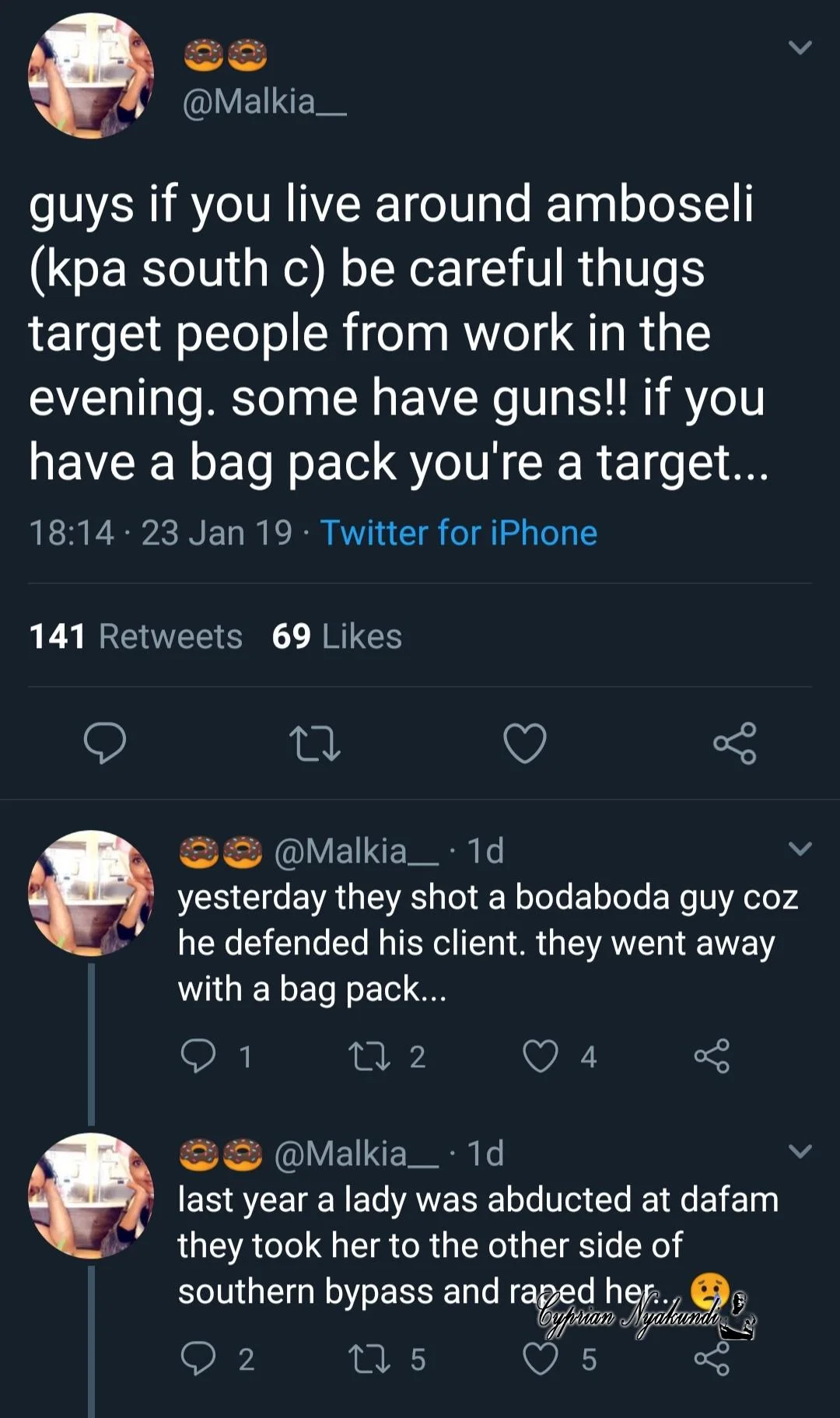 Through her Twitter account, she warned those living near KPA in South C to be on the lookout especially in the evening when walking home from school or work.