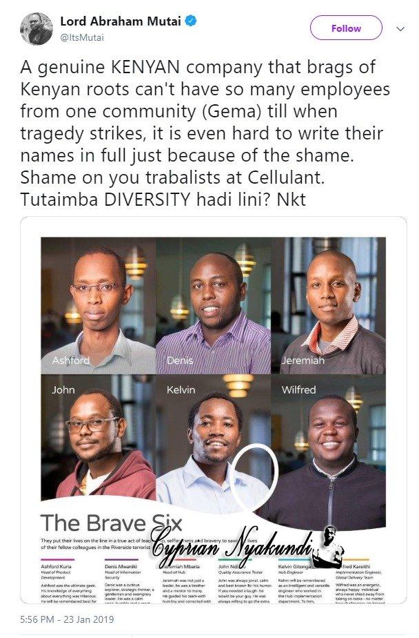 Mutai questioned why the company’s six employees who died in the Riverside Drive Attack were all from the same community.