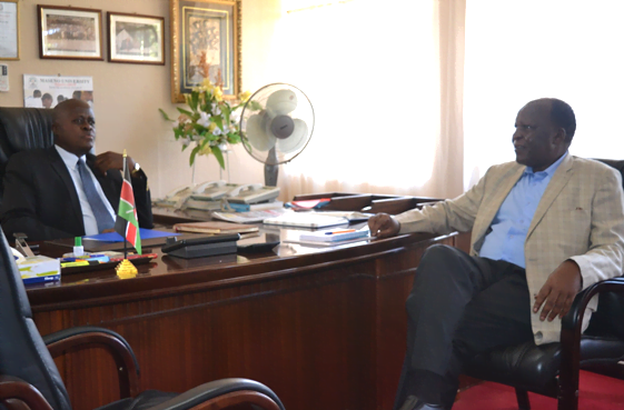 The Deputy Vice-Chancellor, (Partnership, Research & Innovations) Prof. Joseph Chacha (Right) briefing the new Vice-Chancellor Prof. Julius Nyabundi (left) when the new VC reported to office on 1st March 2016.