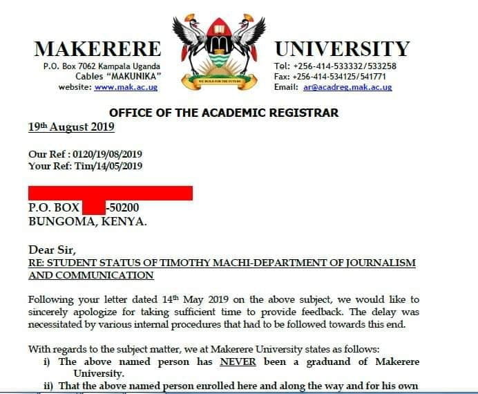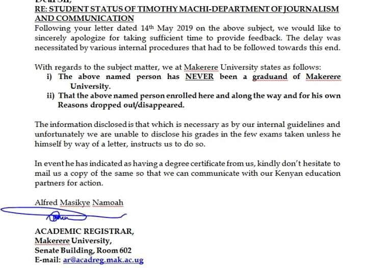 Here is the letter disapproving Timothy Machi as a graduate of Makerere University, Uganda.