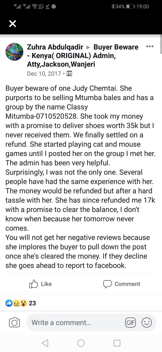 One of the Moms joined and went ahead to share the details of the business with her friends and relatives who were added to the group. On Tuesday 23rd July one of her friend paid Kshs. 40k via mpesa for a bale of Mitumba. Judy confirmed receipt of payment and said that delivery will be done on a Wednesday morning. Long story short, the bale was never delivered till today.