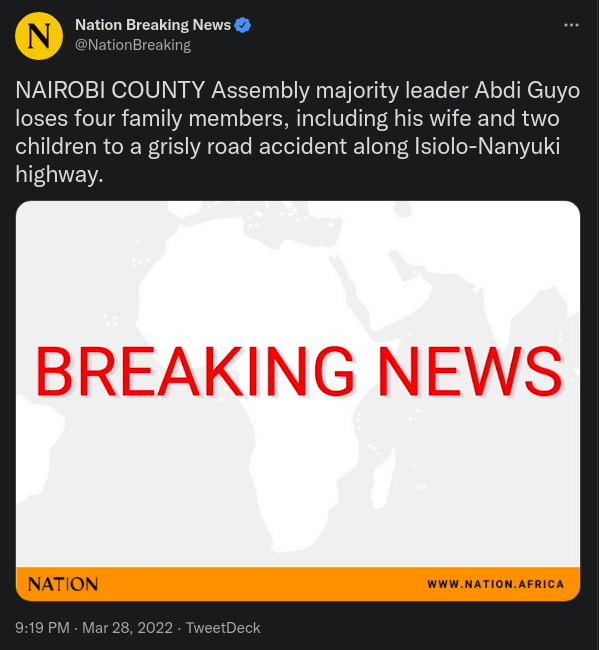 When the news just broke a few moments ago, the Nation Media Group initially reported that the accident had claimed four people including Guyo’s wife and two children.