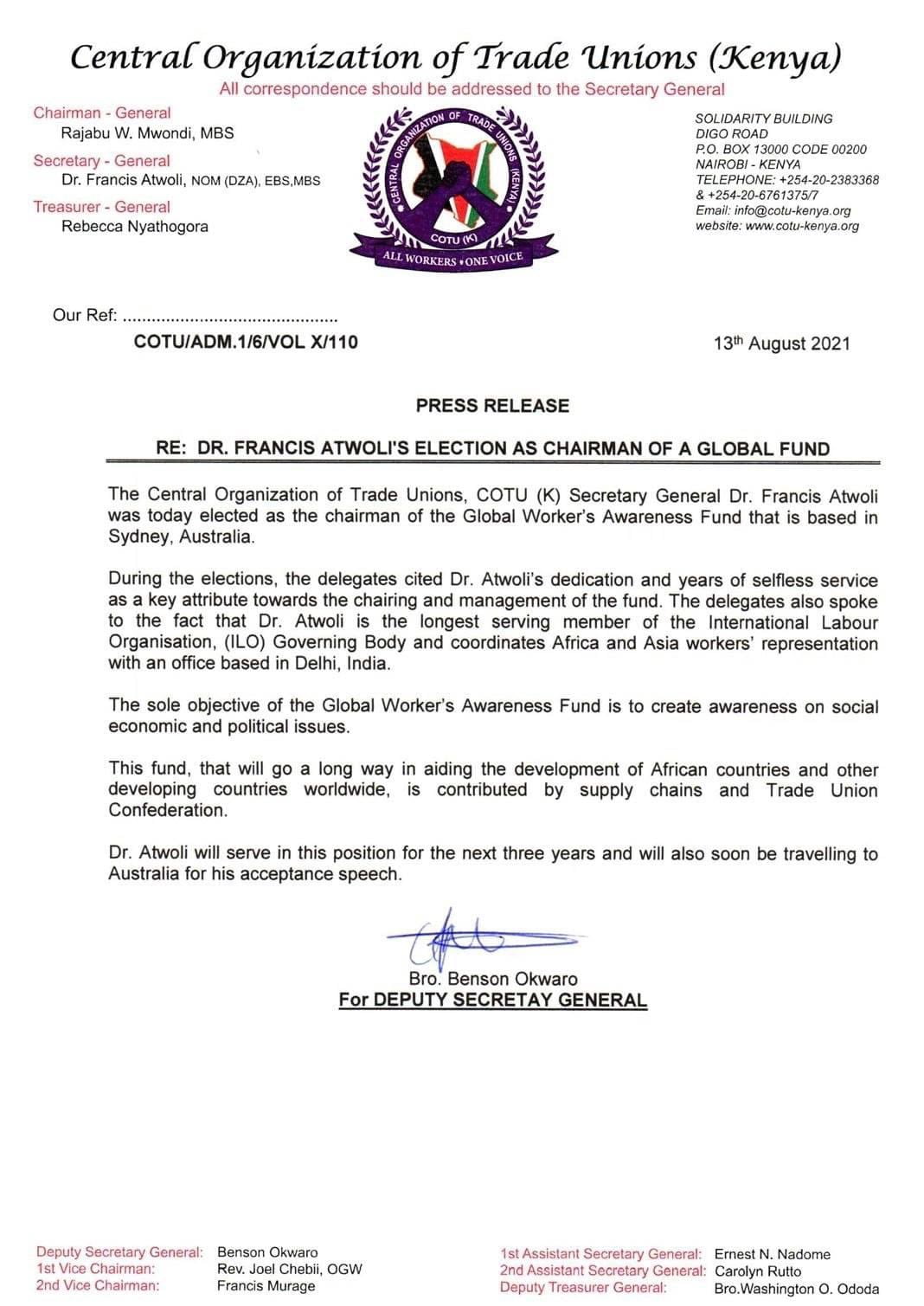Through a statement by the COTU Deputy Secretary-General Benson Okwaro, the workers union said Atwoli was elected the chairperson of the Global Workers Awareness Fund (GWAF) based in Sydney, Australia.