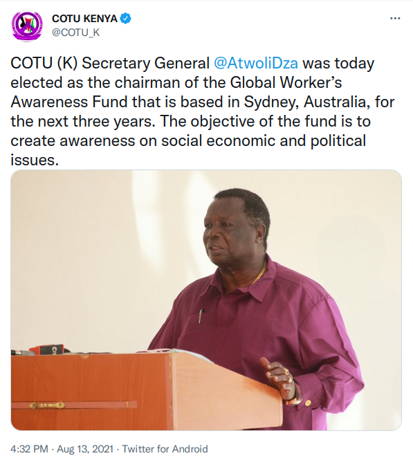 “COTU (K) Secretary-General Francis Atwoli was today elected as the chairman of the Global Worker’s Awareness Fund that is based in Sydney, Australia, for the next three years. The objective of the fund is to create awareness on social economic and political issues,” COTU wrote on their social media page.
