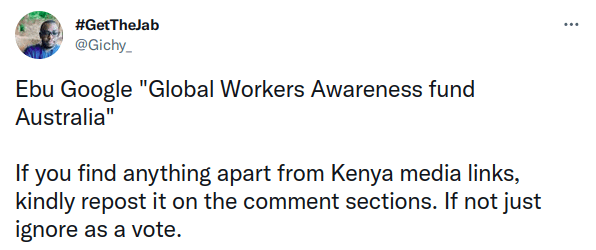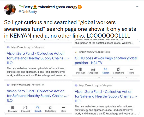 “So I got curious and searched “global workers awareness fund” search page one shows it only exists in KENYAN media, no other links,” wrote Kenyan feminist Betty Waitherero on Twitter.