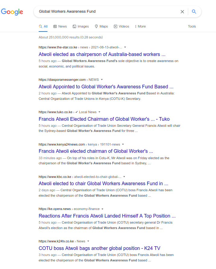 Even more interesting, prior to the post by COTU announcing Atwoli’s election on Friday afternoon, there had been no other mention of the term “Global Worker’s, Awareness Fund” on the platform, ever.