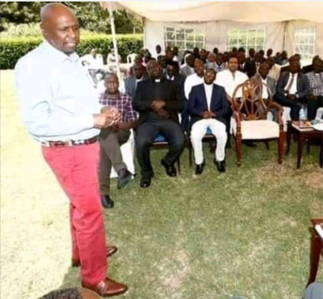 The picture showing the Senator wearing red pants, kneeling before the clergy elicited reaction from controversial lawyer Miguna Miguna who equated it to gayism.