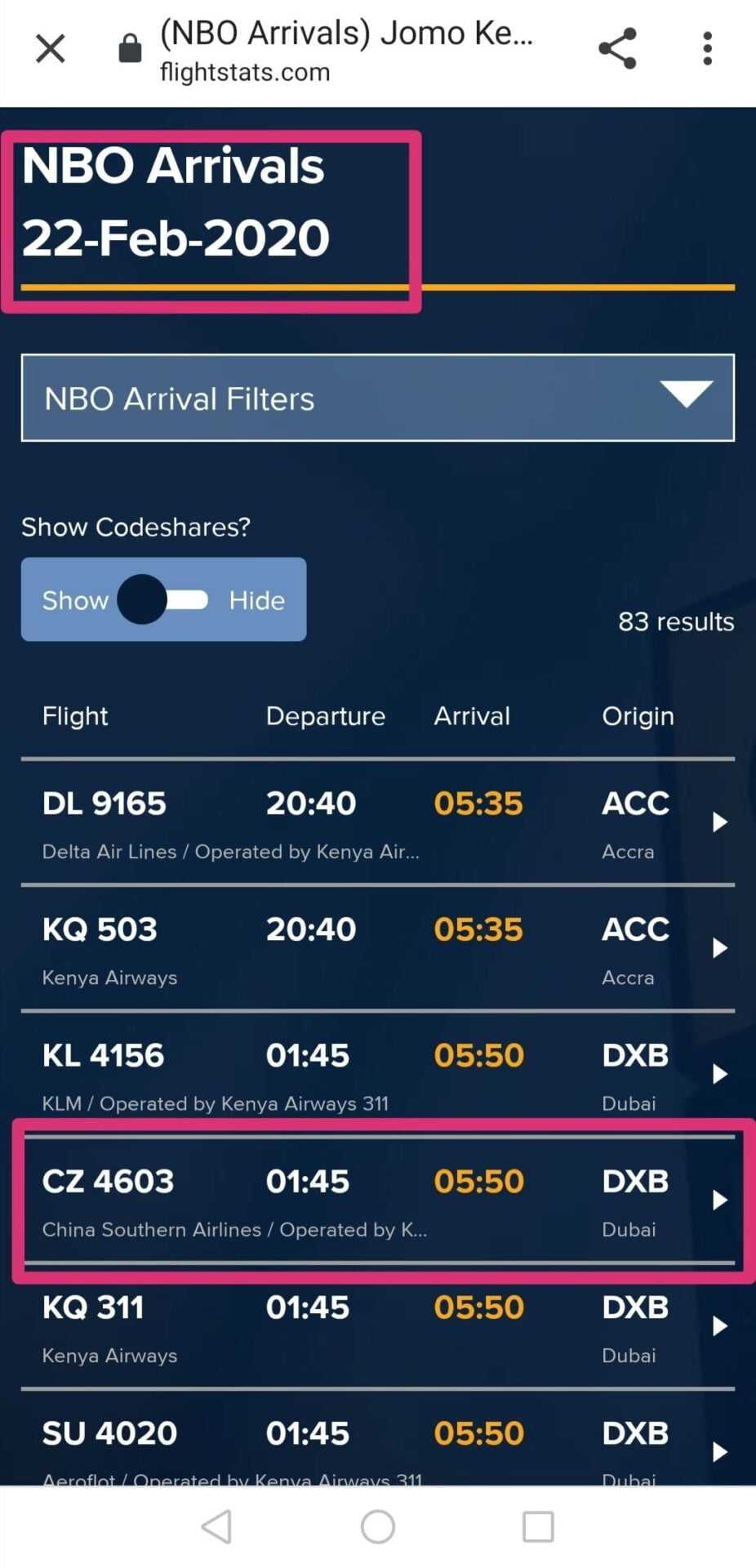 BELOW: Evidence from flightstats showing China Southern Airlines arrivals in Nairobi