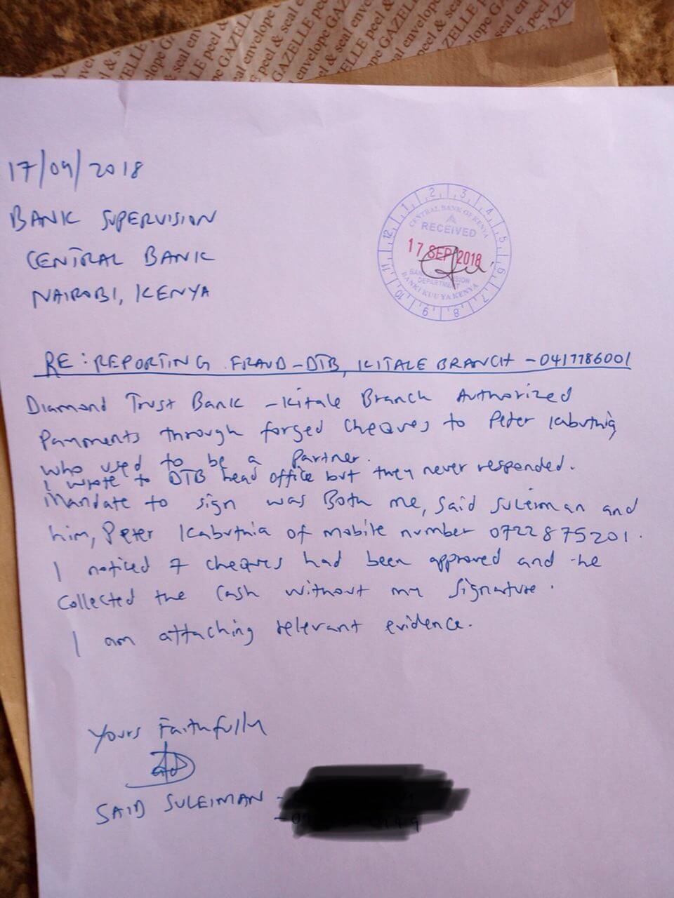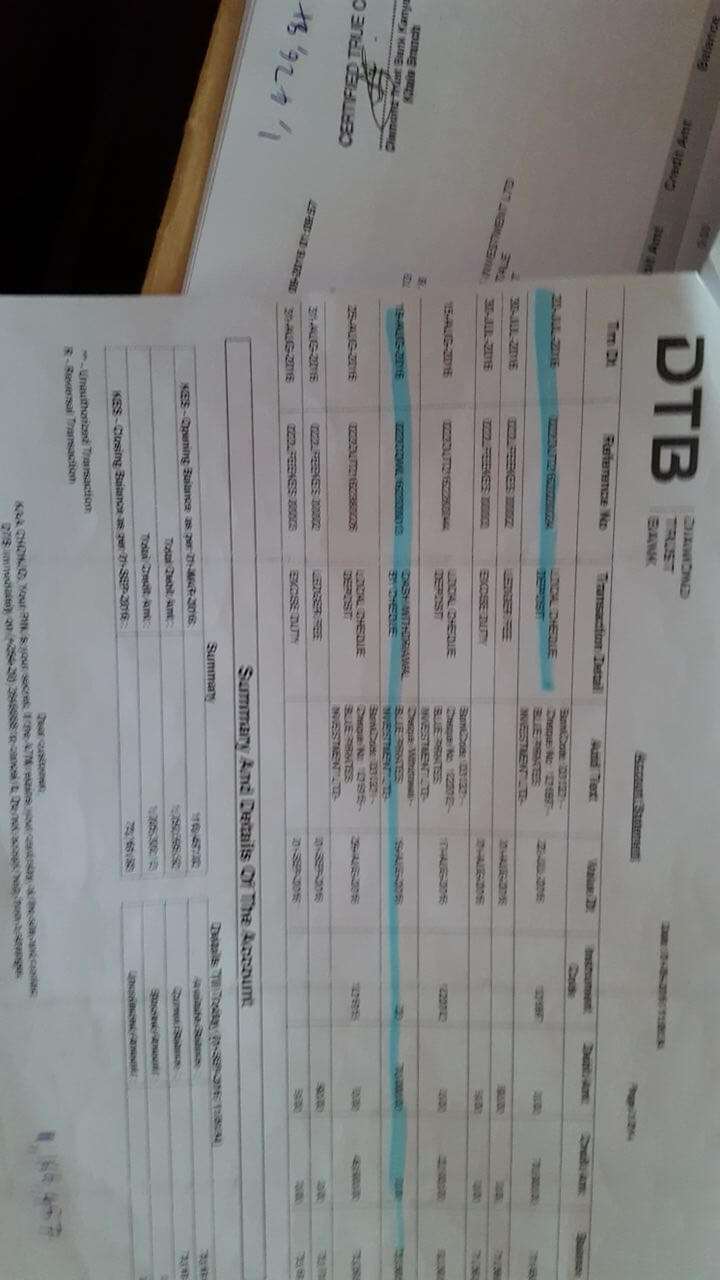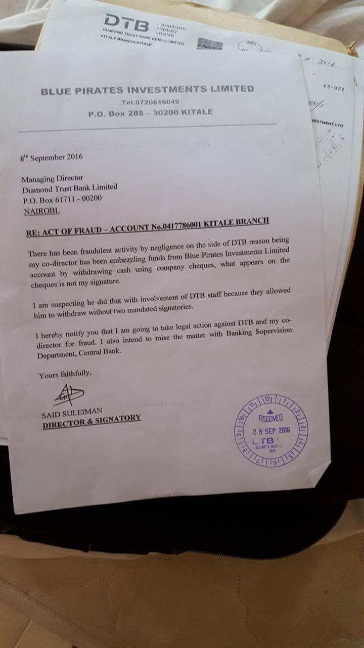 Hi Nyakundi, I opened a bank account with DTB Kitale branch 2014 together with my partner who you will see his details on the letter to Central Bank. Letter To CBK Supervision though Opus Dei Njoroge Is not expected to do anything September 2016 I noticed some withdrawal cheques I wasn't aware about and mandate to s