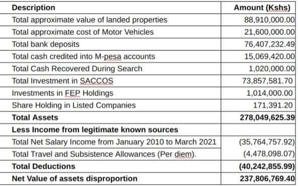 The anti-graft agency received a response on 17th May 2022 which response was considered and after analysis a cumulative assets of value of Ksh 21,432,587.46 was found to have been satisfactorily explained leaving out an unexplained disproportion of Ksh 216,374,181.94.
