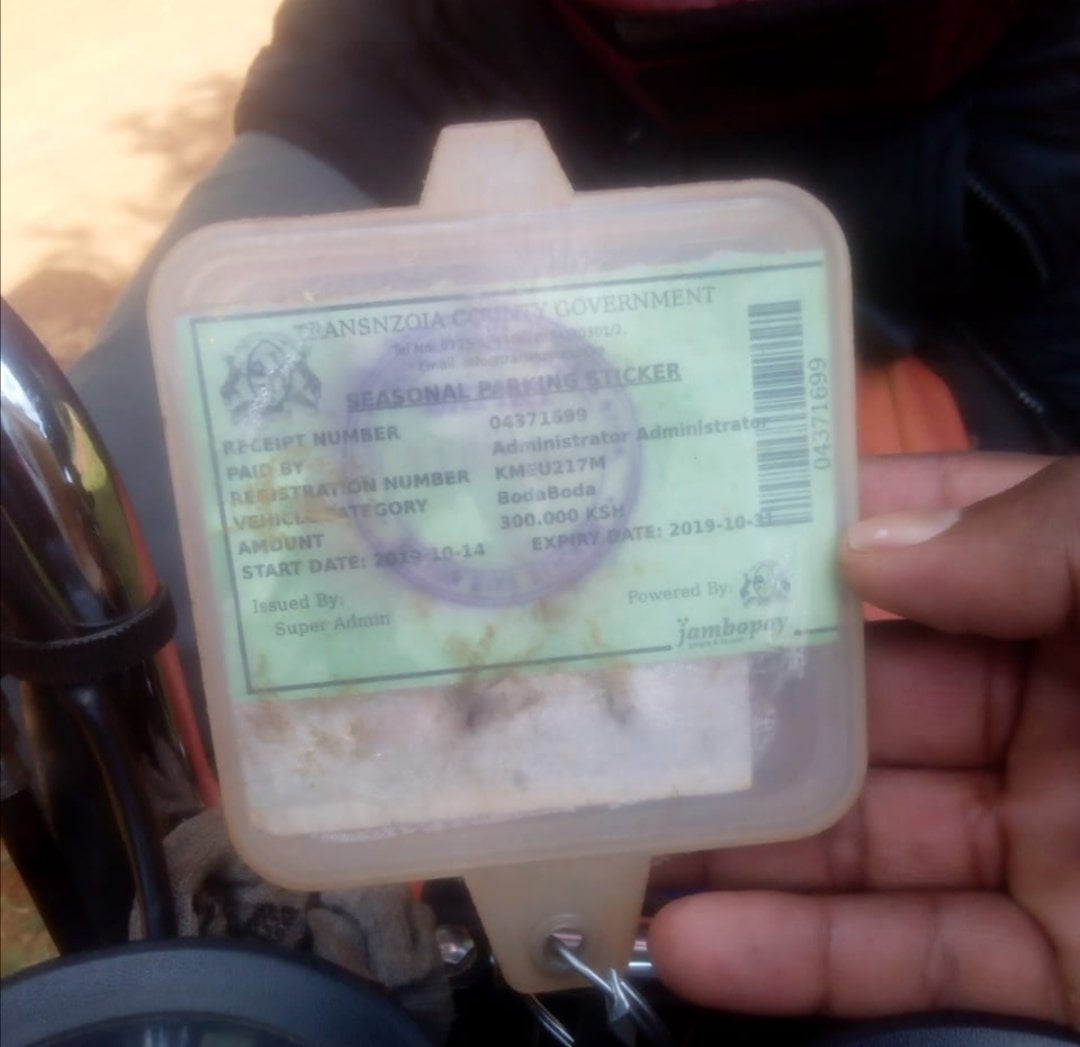 The boda boda ridera are wondering why they're beinh issued with 3 stickers. One from Jambopay (direct link to the lady and a consultant), another issued by revenue office and another issued by enforcement office. They need to know which receipt is legal.