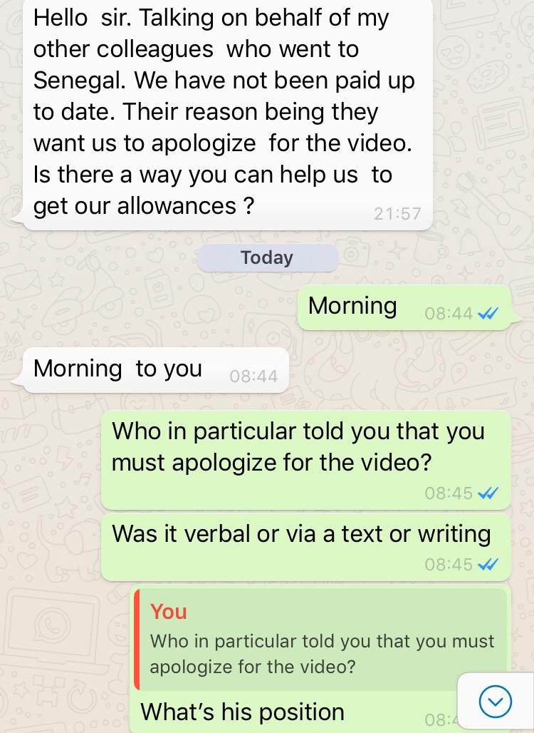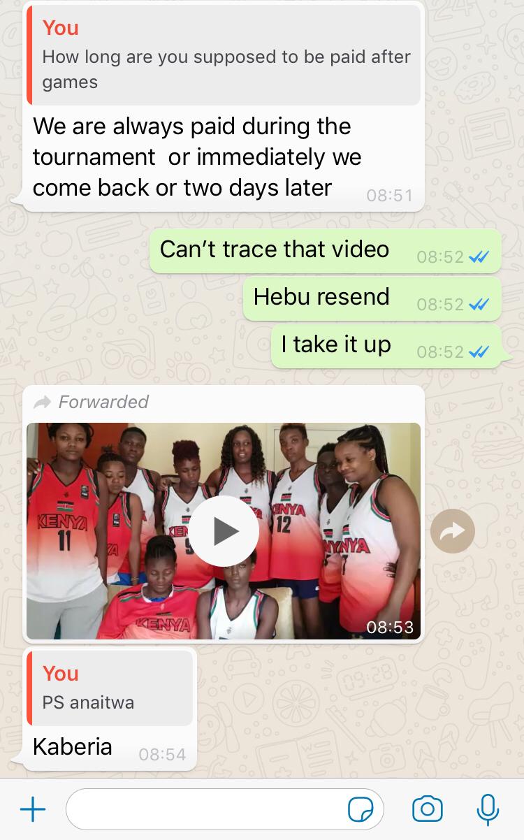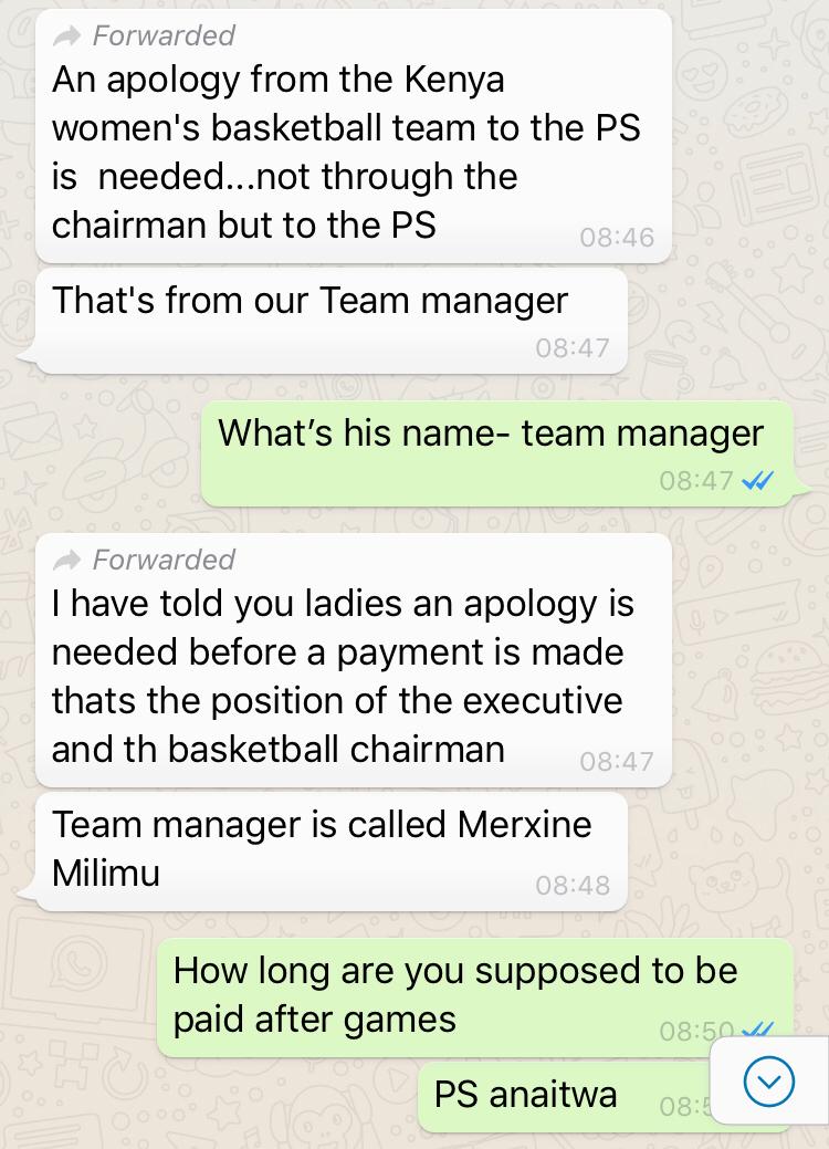 “Hi Nyakundi, hawa wadem wanaambiwa wa apologize to PS Kaberia for doing this video ndio walipwe allowances zao. Wanalia deadly. Yaani PS mzima anatumia positions and his title kufinya wananchi. Mbwa, shoga yeye. One of these chics is our Head of Finance, really feeling sorry for her colleagues who 100% rely on the sport to pay bills and sort school fees. Here is my chat with her. You can publish the messages.”