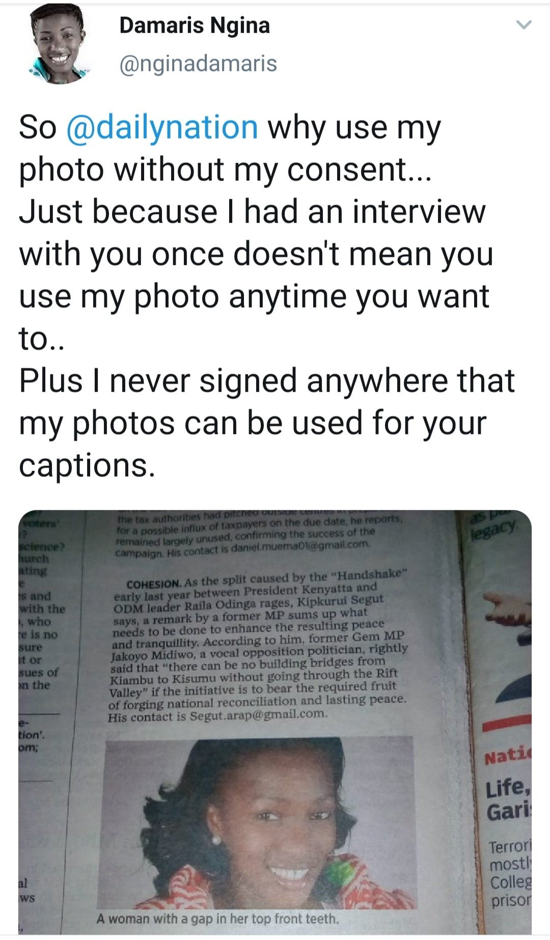 ‘So Daily Nation why use my photo without my consent…Just because I had an interview with you once doesn’t mean you use my photo anytime you want to.. Plus I never signed anywhere that my photos can be used for your captions’, She wrote on her twitter page @nginadamaris