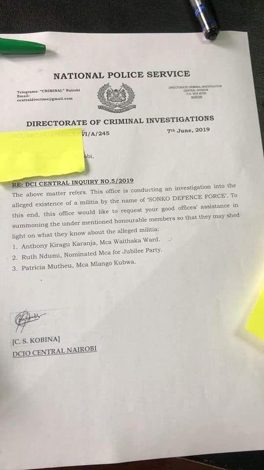 The office of the Directorate of Criminal Investigations (DCI) on Friday morning sent the Nairobi County Assembly a letter with a request to summon three Nairobi MCAs over the existence of a militia by the name “Sonko Rescue Team”.