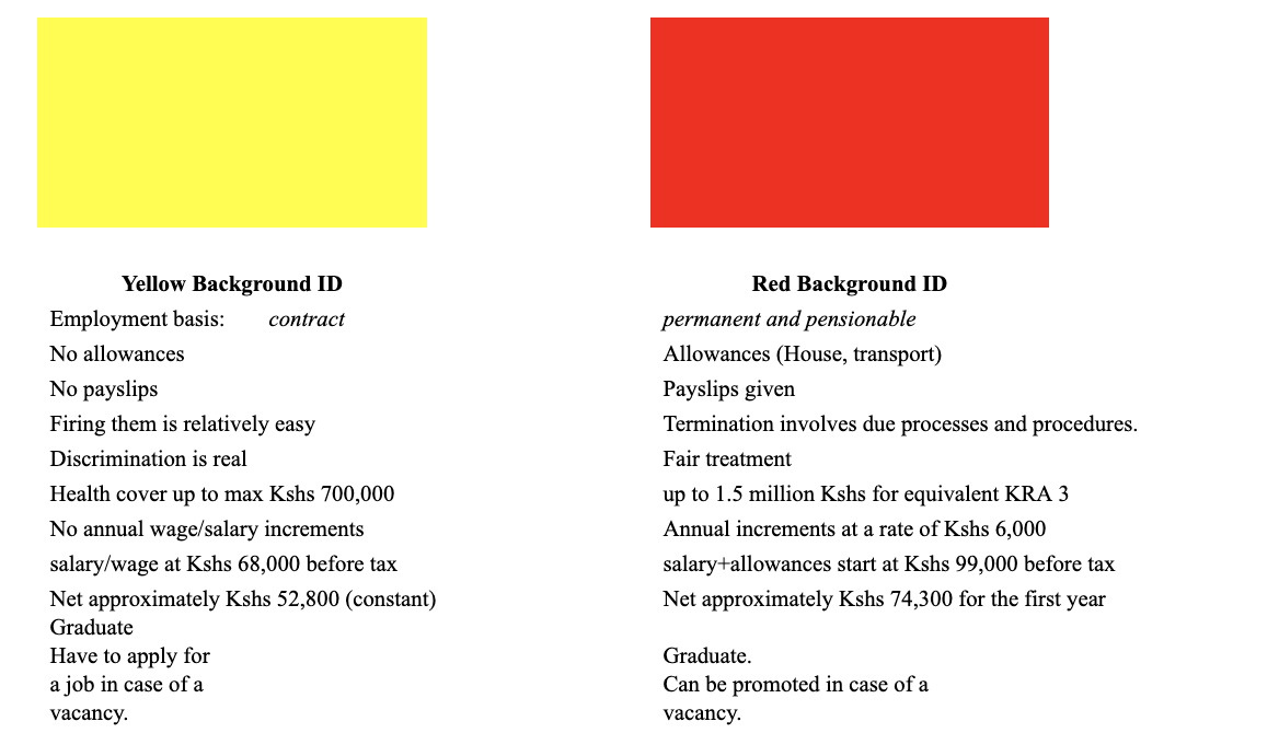 All employees in the same cadre are expected to function/perform the same type of work in as far as revenue collection is concerned; the annual targets are generally the same for both types of employees. It is important to note that some staff have been on contract since 2014 (on similar T&C’s). Some officers (KRA 3) have been in the same job-grade for lengthy periods (some even +10 years). While this is happening, some graduates fresh from college/university with no ‘experience’ in tarmacking and with very little to no job experience are hired to more senior positions for reasons well known to KRA staff and the general public.