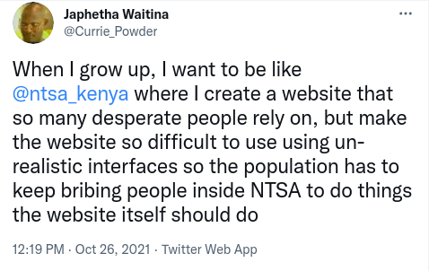 “When I grow up, I want to be like NTSA where I create a website that so many desperate people rely on, but make the website so difficult to use using un-realistic interfaces so the population has to keep bribing people inside NTSA to do things the website itself should dO,” he wrote.