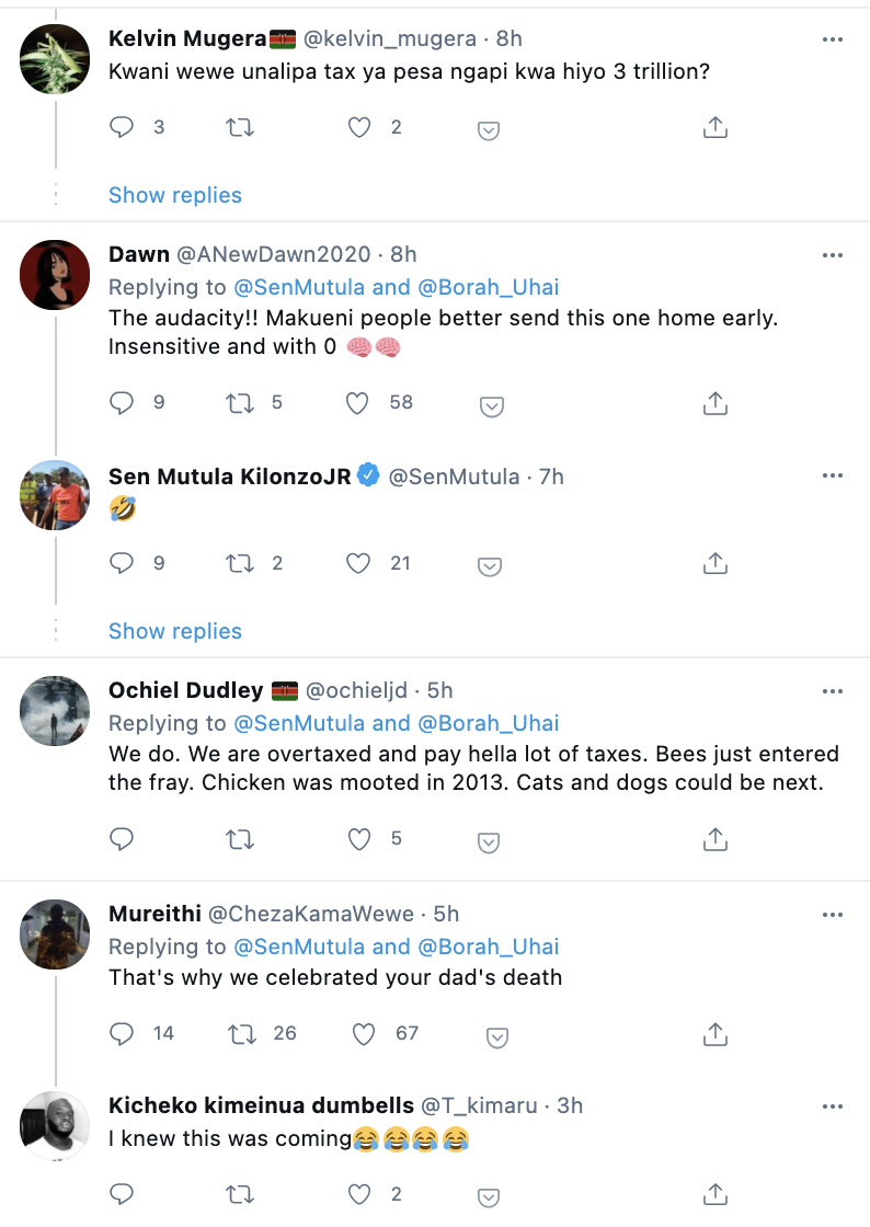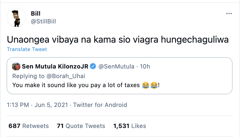 The Kenyan responded to Mutula Kilonzo’s tweet by saying ” Unaongea vibaya na kama sio viagra hungechaguliwa” in reference to a popular allegation that his father Mutula Kilonzo died of Viagra overdose.
